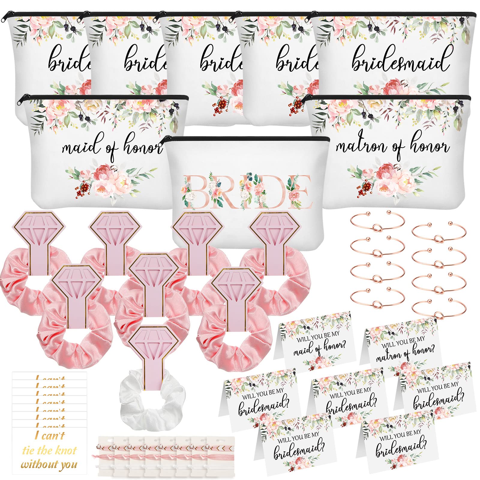63 Pcs Bridesmaid Proposal Gift Sets Maid of Honor Matron of Honor Bride Gifts Bridal Shower Cosmetic Makeup Bags Scrunchies Hair Knotted Bracelets Invitation Cards for Wedding (Flowers)
