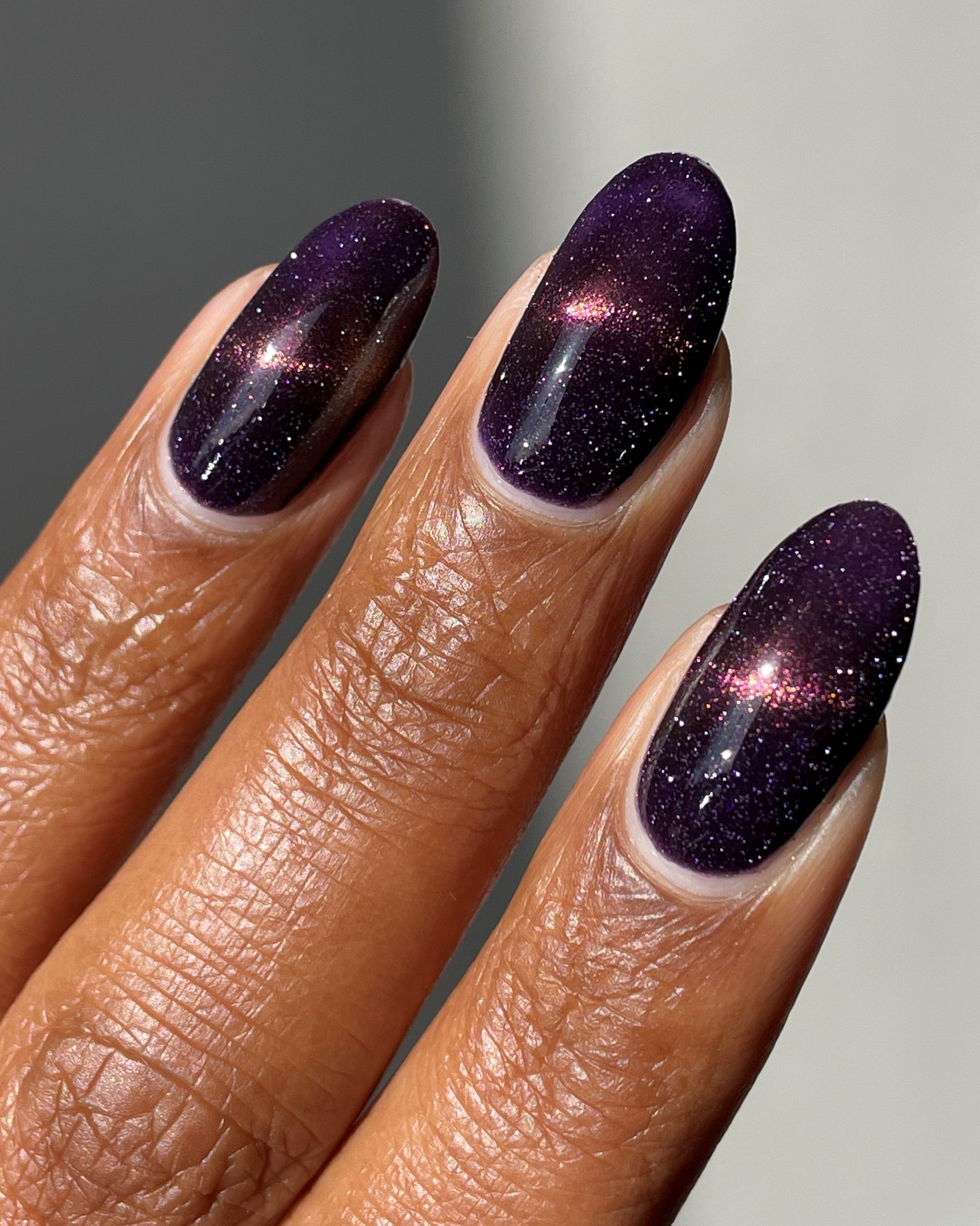 BEWARE, THE KRAKEN is a deep violet magnetic multichrome lacquer filled with reflective glitter that creates a color-shifting olive-magenta-peach stripe. from the EXPEDITION: ATLANTIS set.