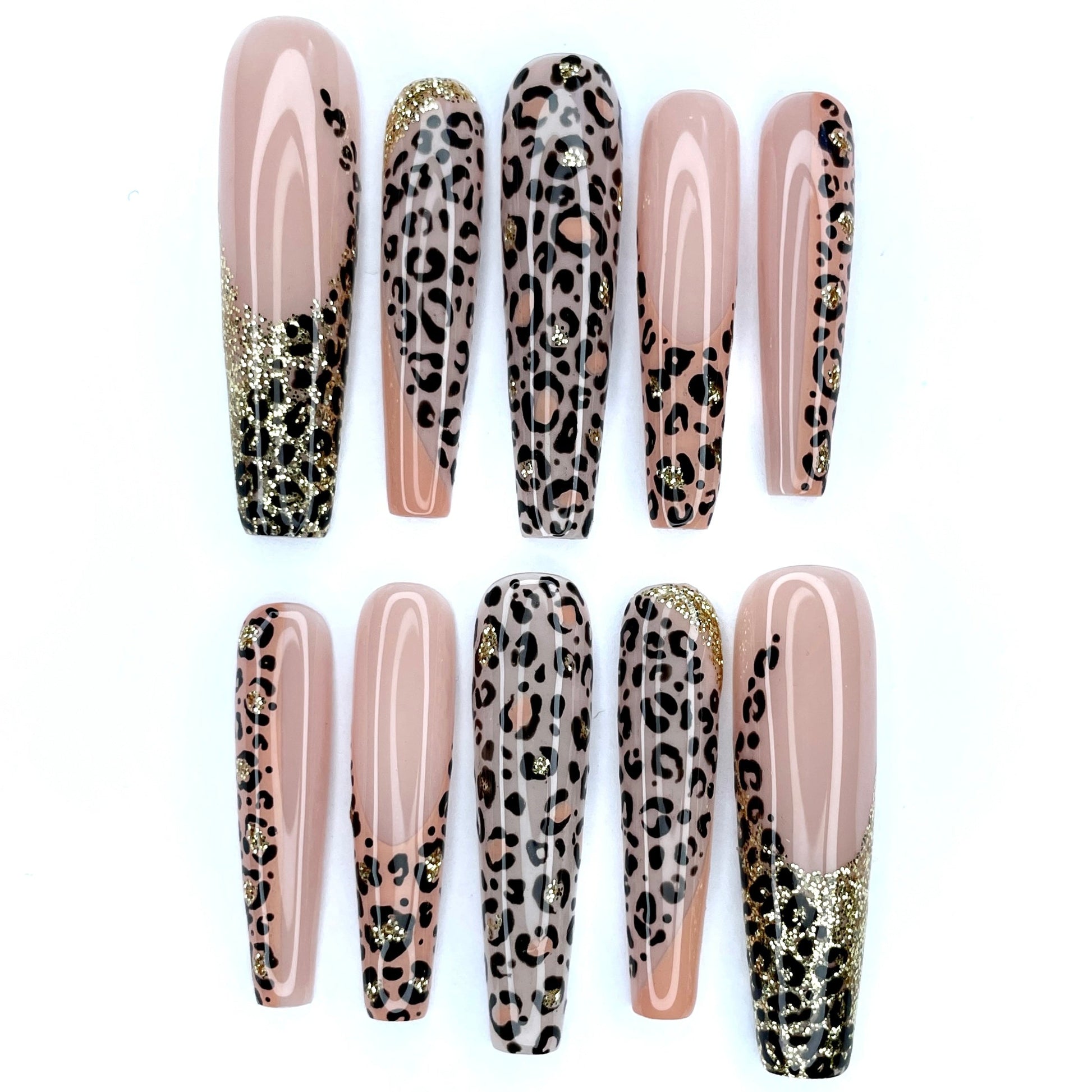Unleash your wild side with these elegant gilded cheetah print nails, featuring a natural sheer pinky nude base