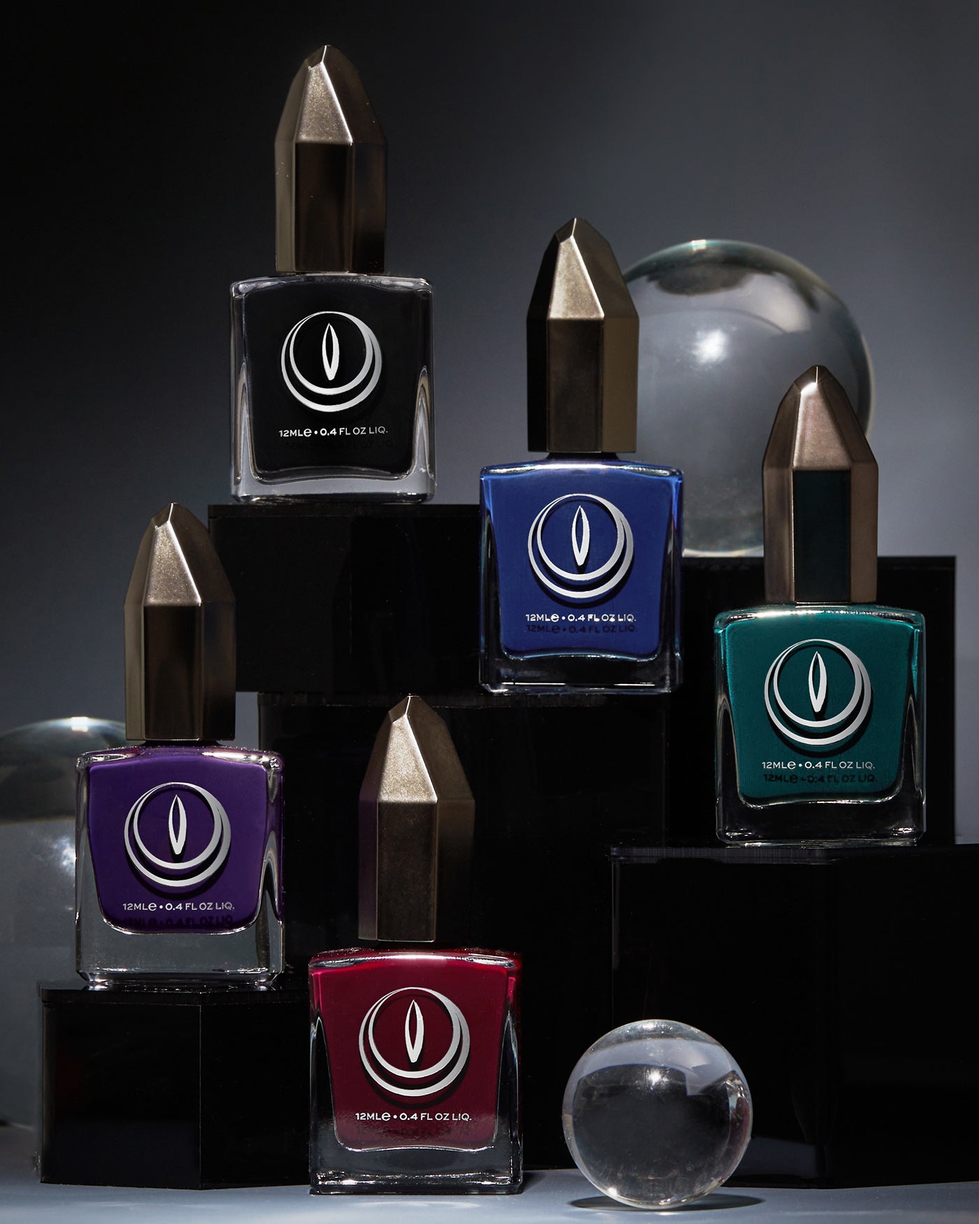 the DARK ARTS 101 SET set includes EMO FOR LIFE, a one-coat black creme lacquer, INTO THE ABYSS, a deep midnight creme lacquer, POISON IVY, a rich forest creme lacquer, FROM THE ASHES, a sultry oxblood creme lacquer, and QUEEN OF CHAOS, a regal amethyst creme lacquer.