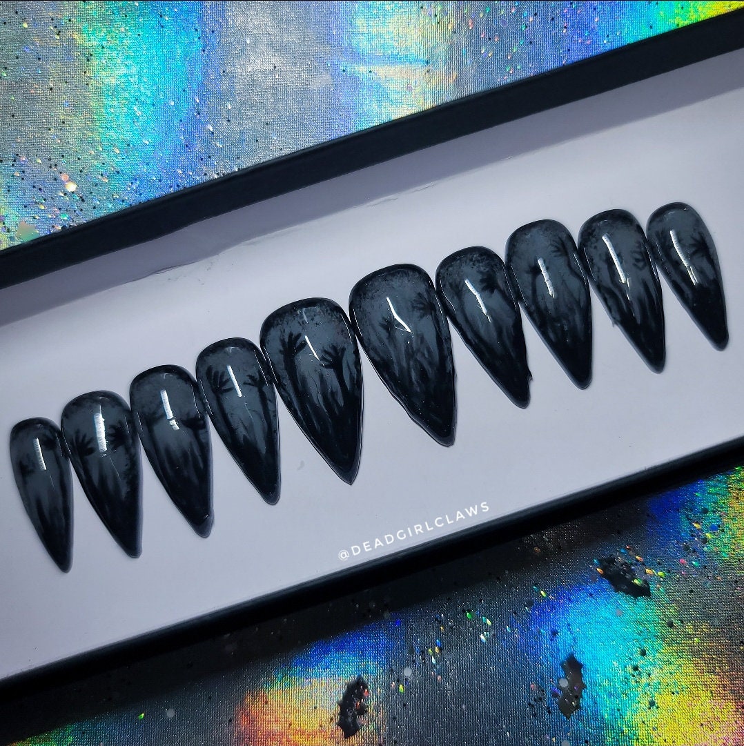 Dark Souls is a Cement Grey nail set that turns to a lighter grey when placed in warmer temperatures and glows in the dark a vivid blue! The Overall Vibe of this set is meant to be a grungy creepy feel