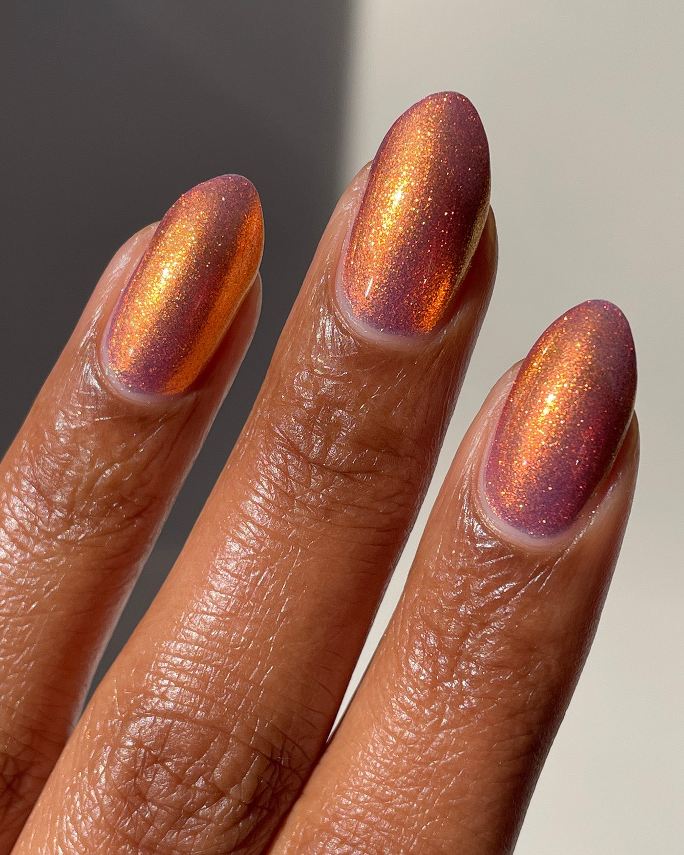 FLIGHT OF THE MONARCHS is an orange lacquer filled with color-shifting orange-to-amber-to-pink-to-purple shimmer. from the LOST IN A FOLKTALE SET.