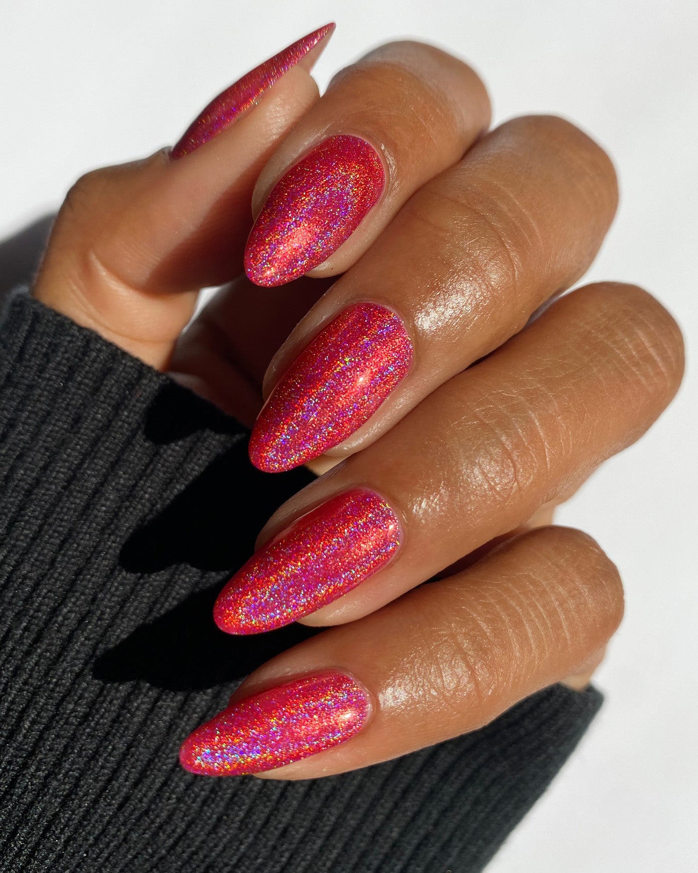 there's no turning back for this cunning holographic lacquer. this bright red shade glows with an intensity and rage that just won’t quit. game over is a bright rosy red polish with a linear holographic flare.