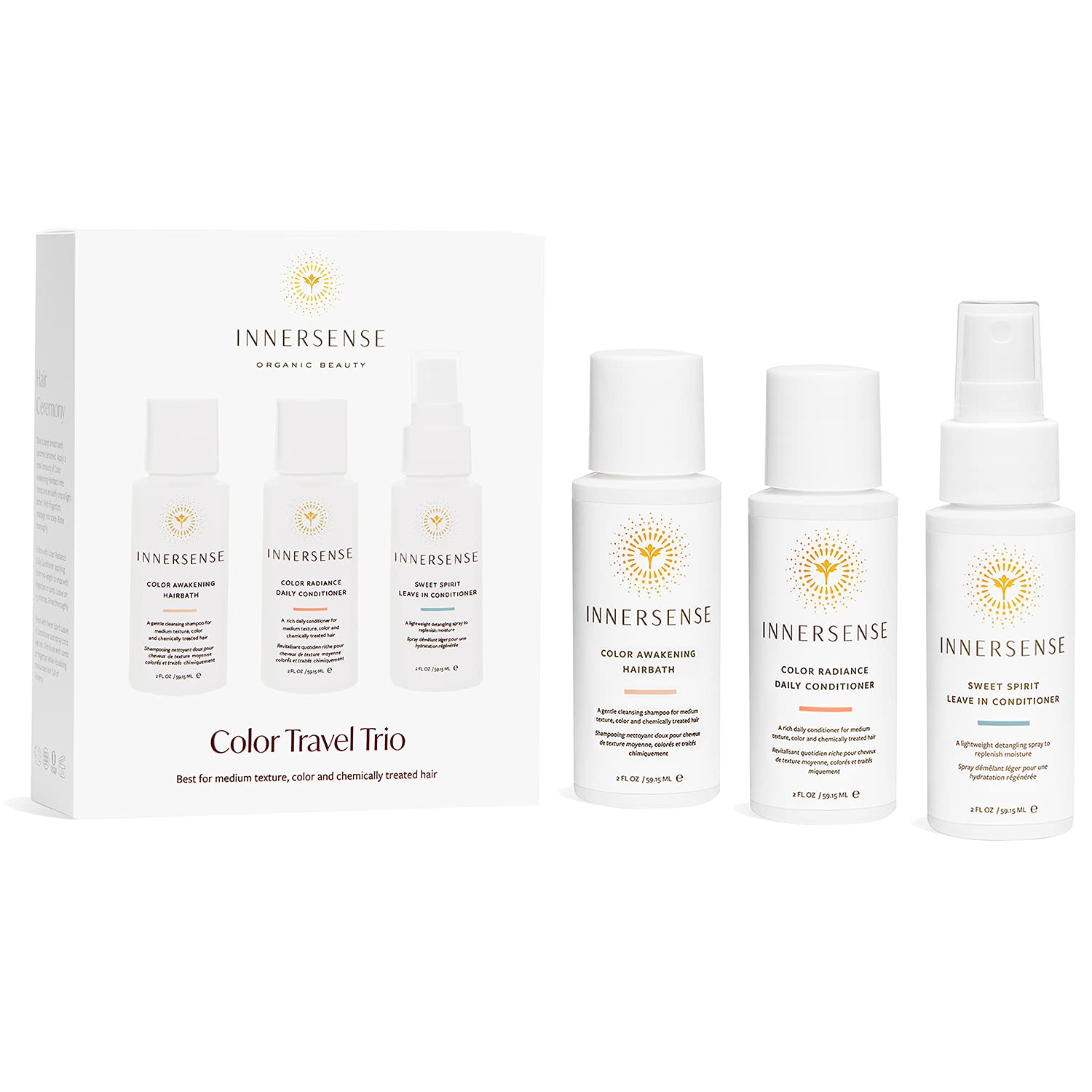Details: Innersense Organic Beauty Color Travel Trio is 100% color safe. Keeps color vibrant, healthy and hydrated. Best for chemically processed hair, works well with all hair types. Includes: Color Awakening Hairbath, Color Radiance Daily Conditioner and Sweet Spirit Leave In Conditioner (all 2 oz sizes)