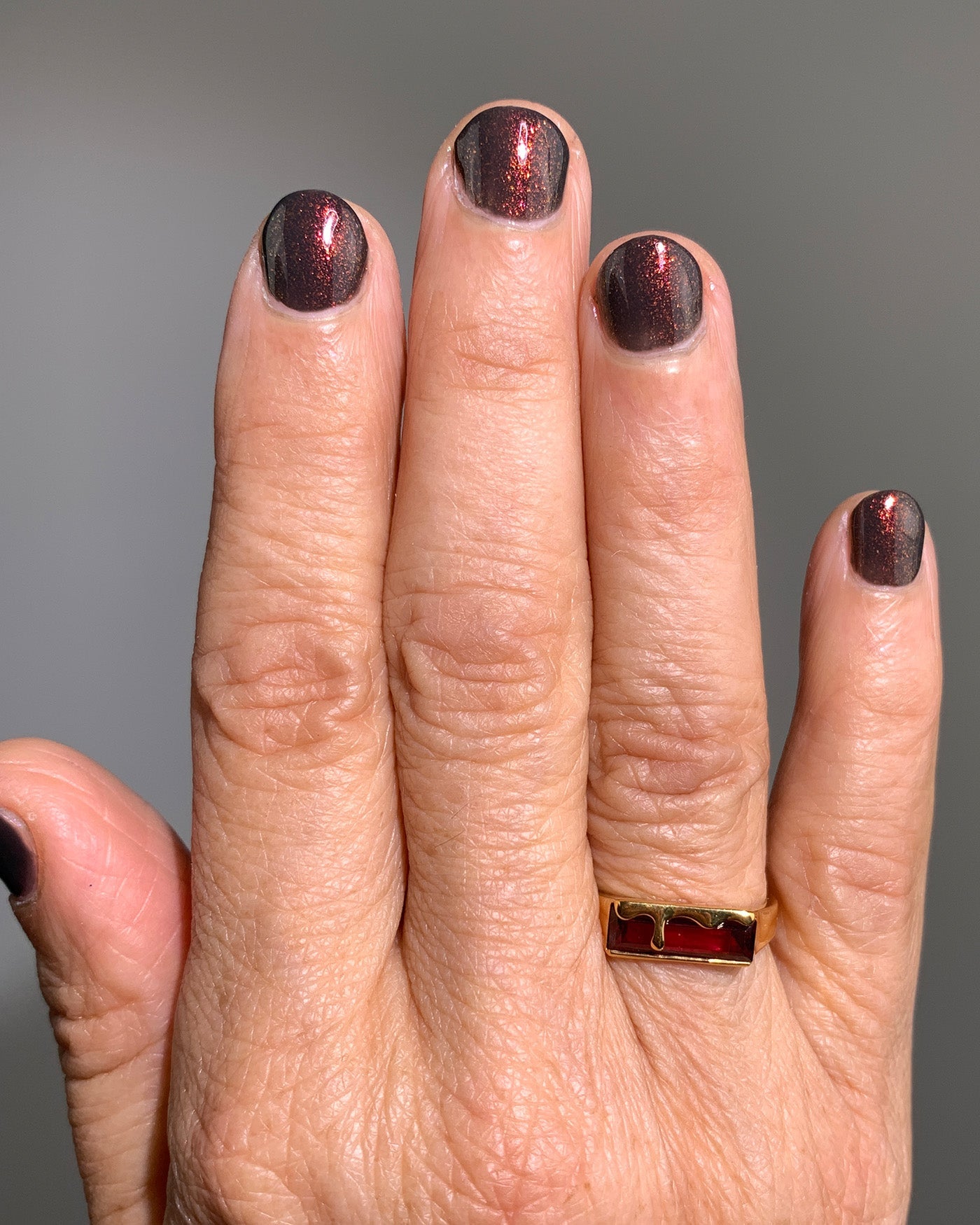 LIKE A MOTH TO A FLAME is a smokey gray lacquer filled with color-shifting red-orange-green shimmer. from the MY INNER APOCALYPSE: AN EP FOR EXISTENTIAL DAYS SET.