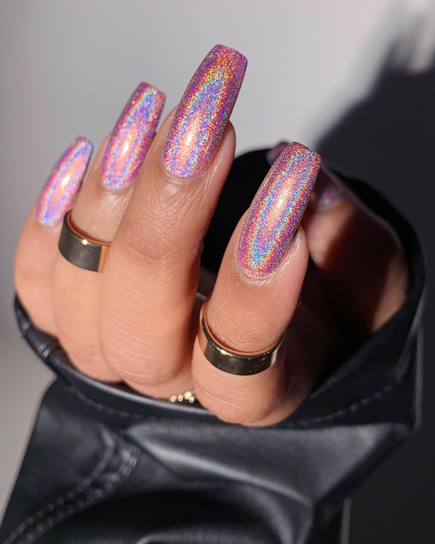 note: holographic lacquers look best in the sunlight or under a direct light, where they reveal their full rainbow effect. in the shade or overcast conditions, the effect will be more muted (but still mesmerizing).