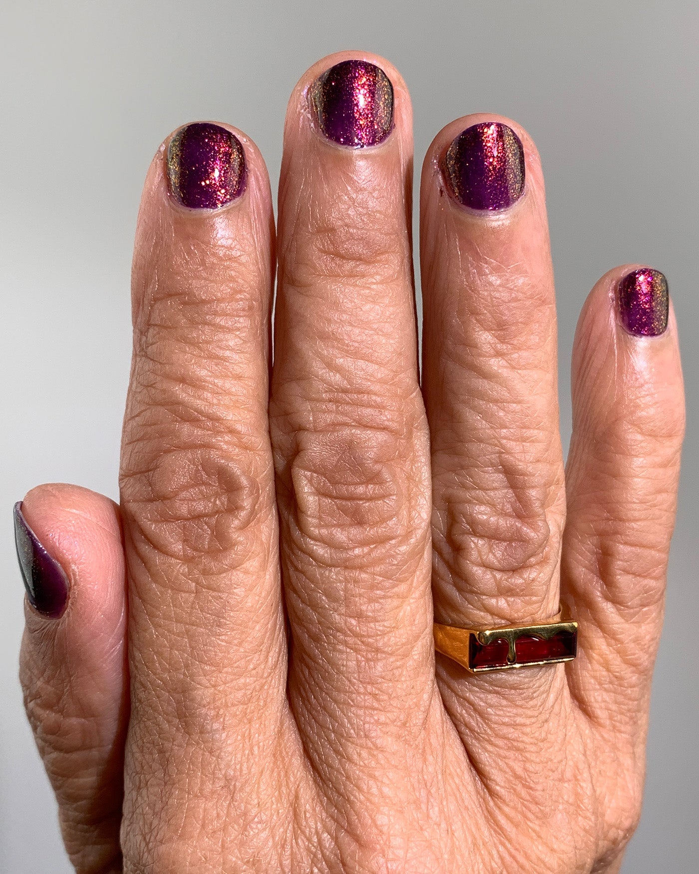 leave your bad luck behind. let this moody, broody deep wine purple lacquer swallow all your claw misdoings whole. with a captivating wave of color-shifting pigment and a slow simmering blaze of shimmering red, orange, and green shades, it’ll help erode evildoings past…while allowing for a fresh slew of sinister plots to brew.SIN EATER is a deep wine purple lacquer filled with subtle color-shifting red-to-orange-to-green shimmer. from the BAND OF MISFITS SET.