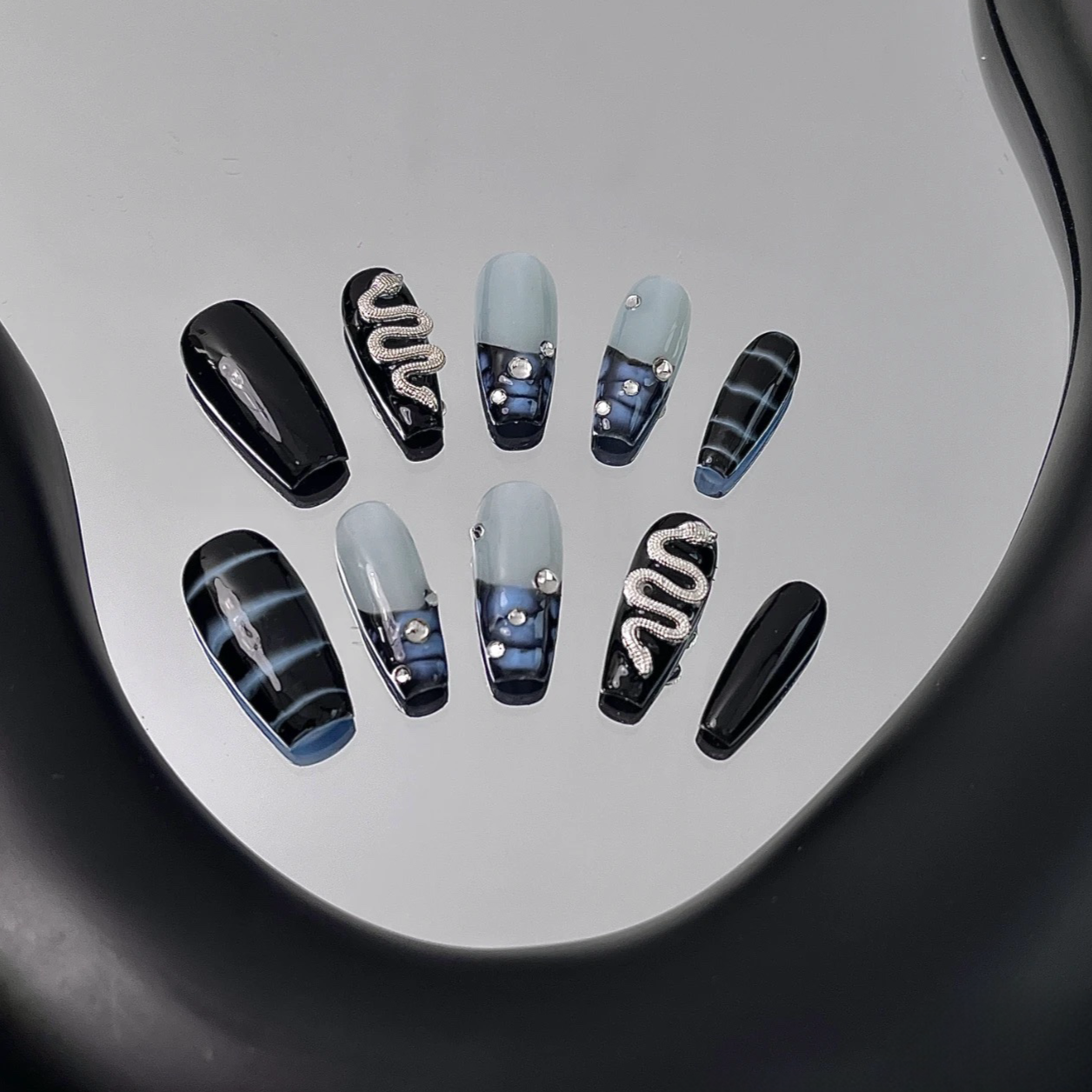 Indulge in the allure of Serpentine Elegance - where the celestial blue meets sleek black in a dance of modern sophistication. Elevate your style with this wearable armor, a testament to your bold and captivating fashion sense.