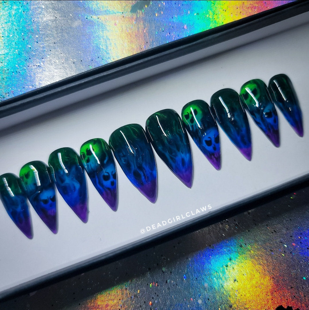 Spooky Skulls is a Black Based Nail set with Hand Painted Smoke and Skull nail art with a Purple, Blue, Teal and Green Ombre effect!