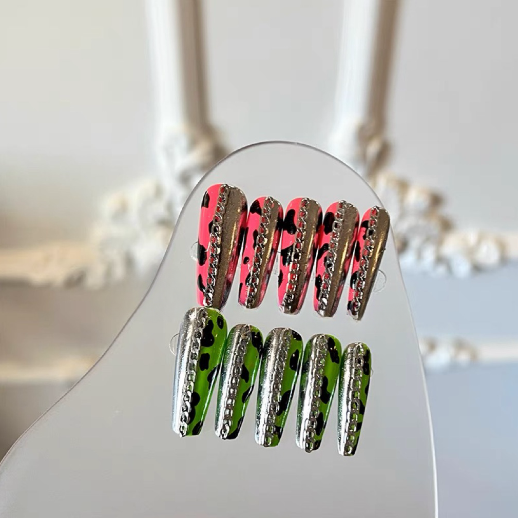 - The fusion of pink and green spotted chainlink elements creates a unique and eclectic design that sets you apart from the crowd, showcasing your individuality and bold fashion sense.