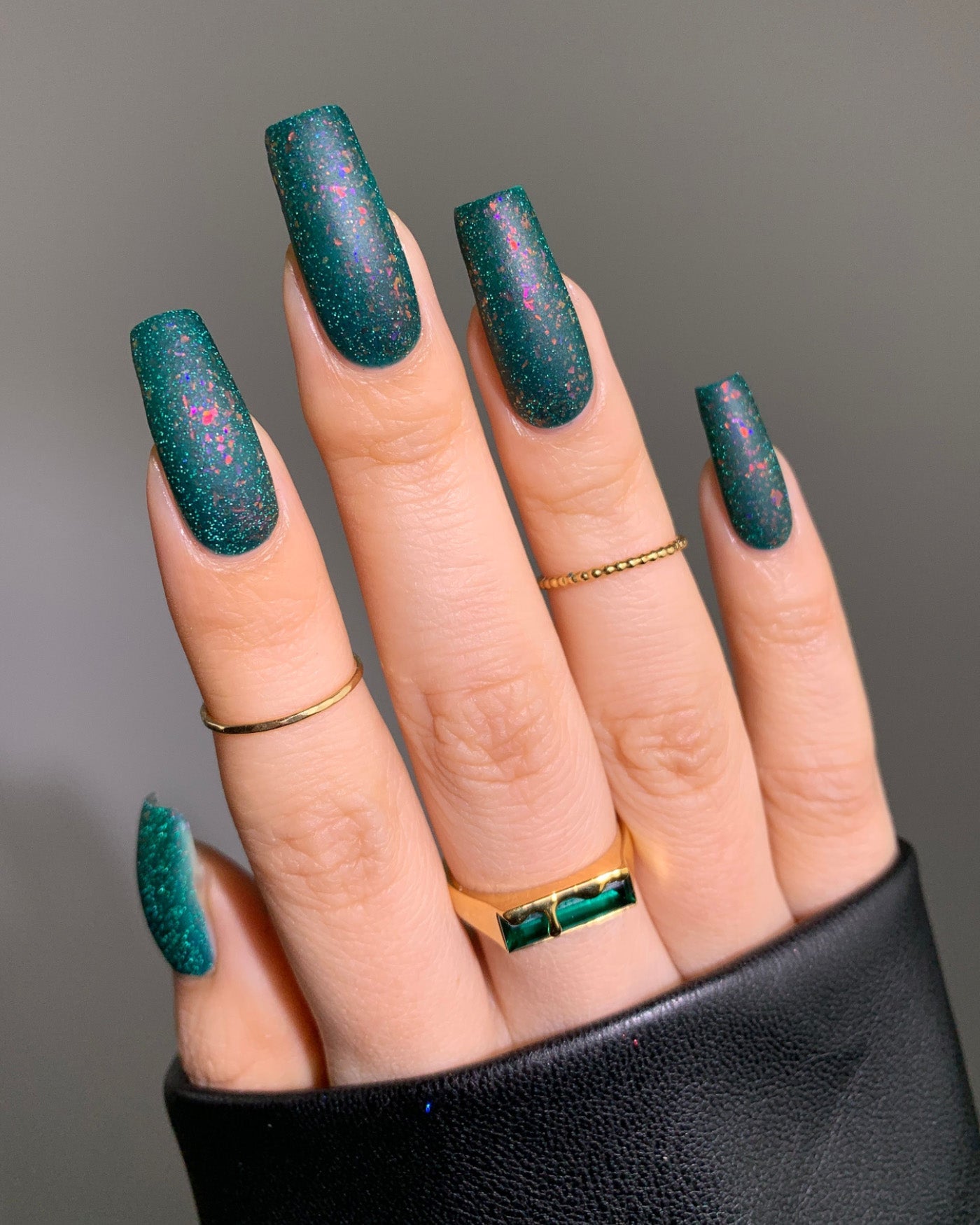 VELOCIRAPTOR is a matte dark teal lacquer filled with color-shifting orange-to-purple iridescent flakies and reflective glitter. from the PRETTY PREHISTORIC SET.