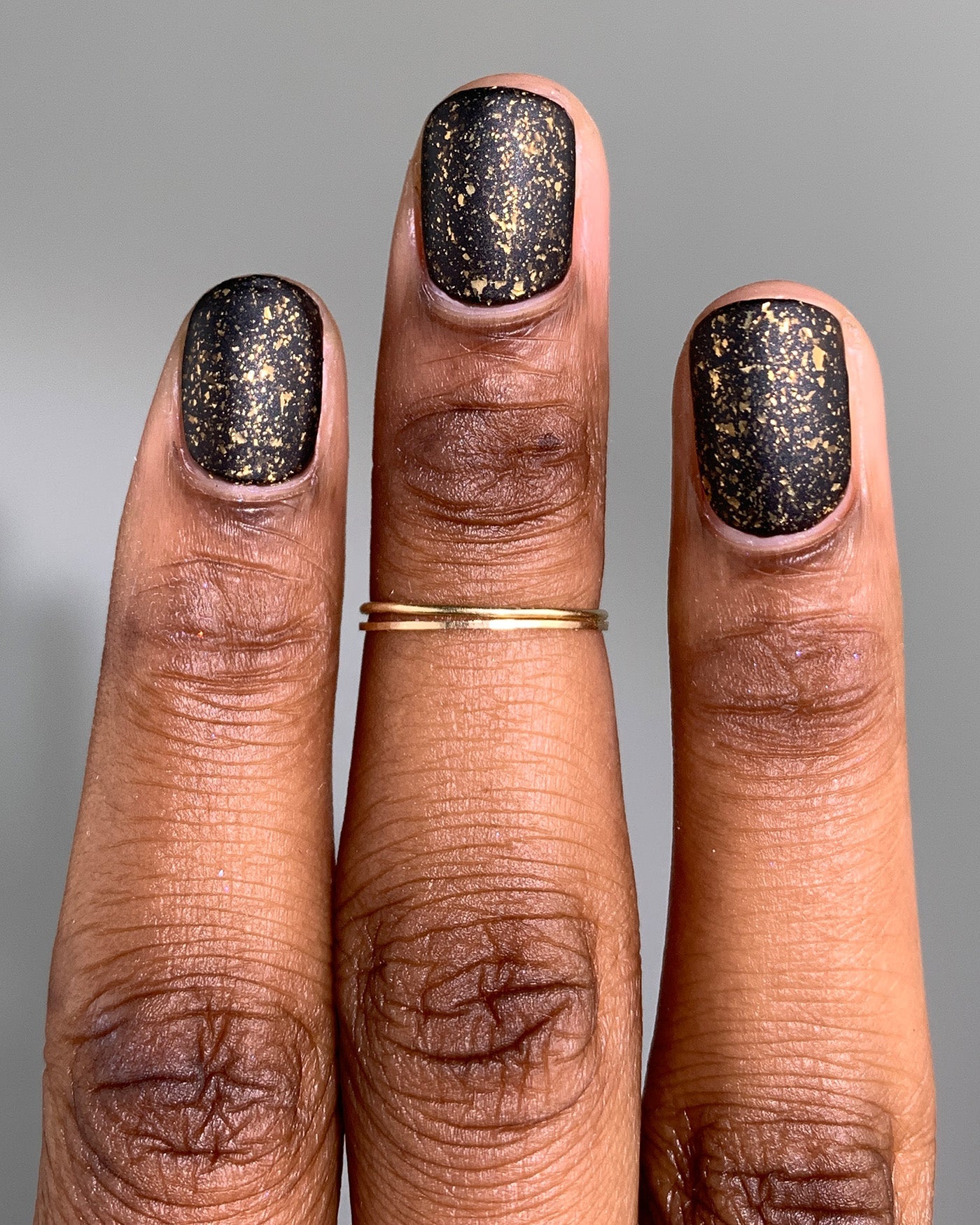 from the dust of broken halos, comes a truly electrifying matte shade. you never know when sudden bursts of golden flakes may strike against its gloom-filled, black-cloud-like matte backdrop…so saddle up, and take your claws for a wild, wild ride.WHEN THE DEVIL STRIKES is a matte black lacquer filled with golden flakies. from the MIDNIGHT RODEO SET.