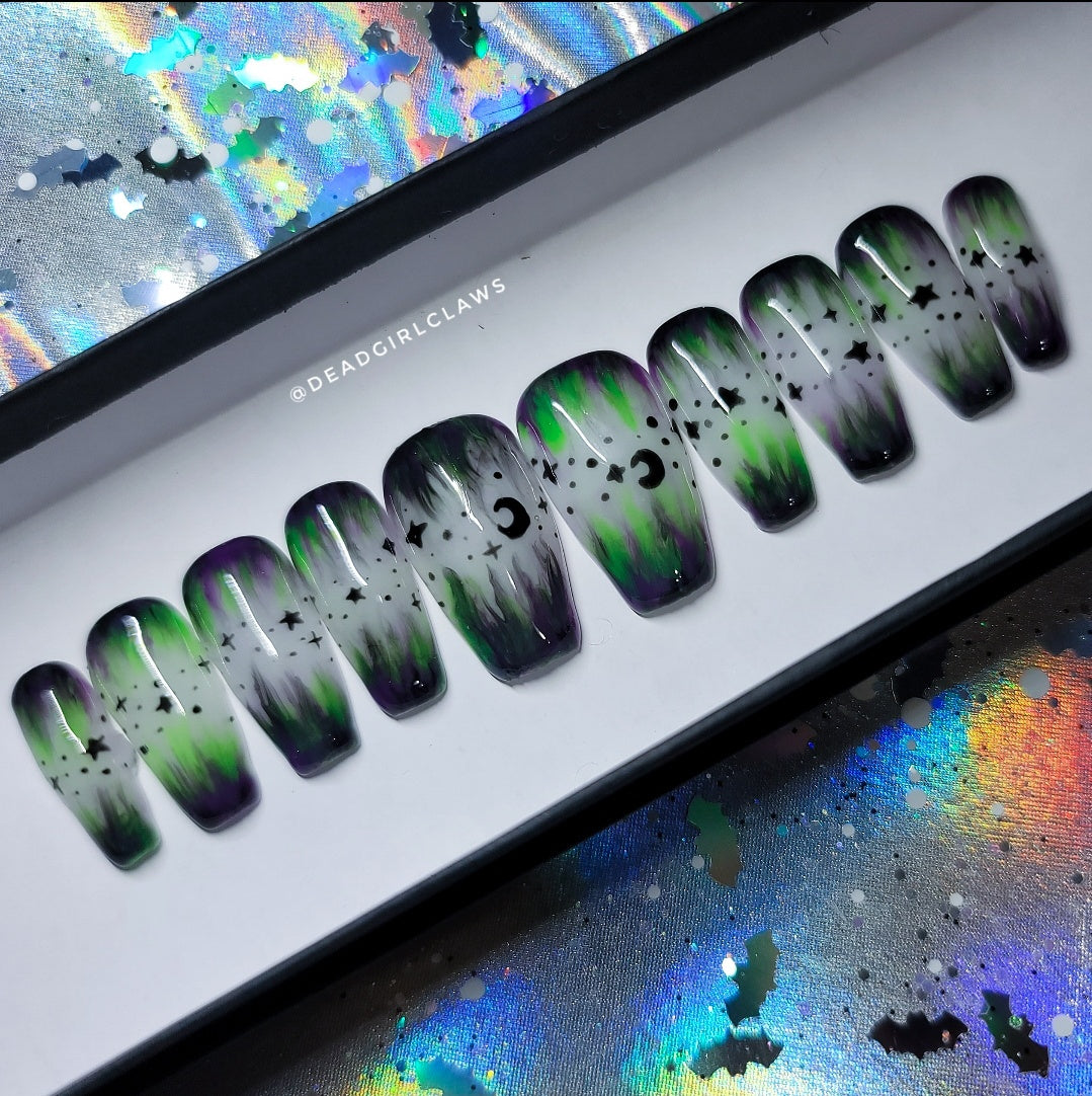 Witches Brew is a milky white based nail set with all Hand painted nail art. Each nail is created to have a purple, green and black flame effect with stars and moons throughout all 10 nails. NAIL STYLE IN PHOTO IS MEDIUM COFFIN
